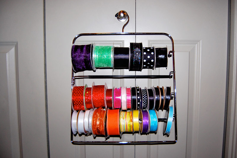 Inspired by this pin, I transformed a swing-arm pants hanger into a ribbon organizer. I love ribbon and can hardly resist buying more every time I make a trip to the craft store. Instead of having it all raveled up in a box, I now have all my spools easily accessible, color coordinated, and ready for use! It fits perfectly in my craft closet (aka laundry closet) and can be grabbed for quick use at a moments notice. No more digging through a messy ribbon box!