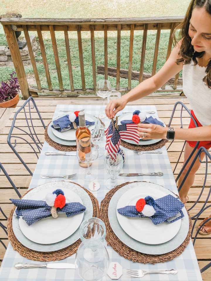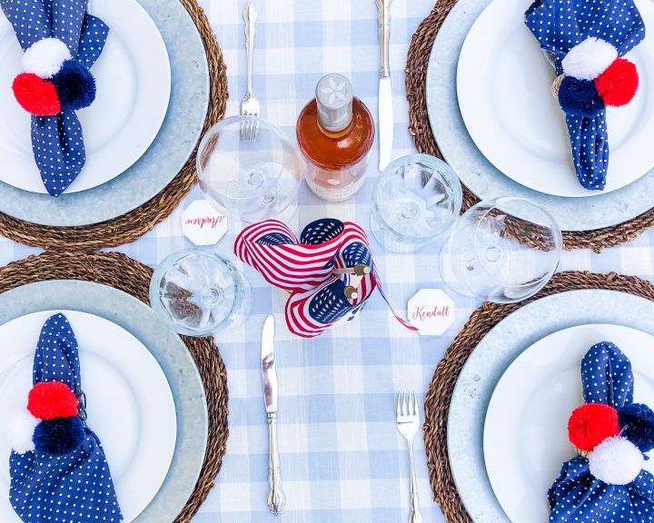 While I contemplated making the poms on my own, I was excited to discover Michaels is carrying patriotic pom pom garland this year, making my job so much simpler. A quick curbside pickup, and Amazon order of some napkin rings and I was ready.