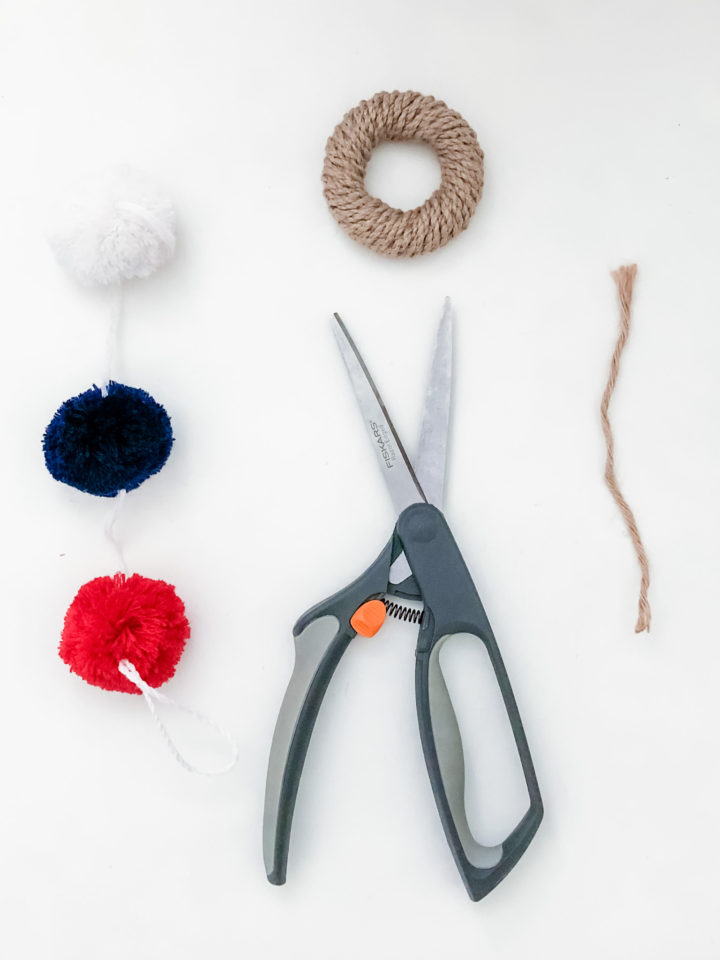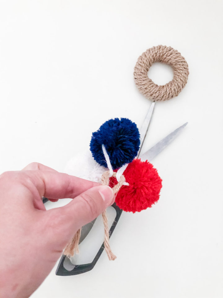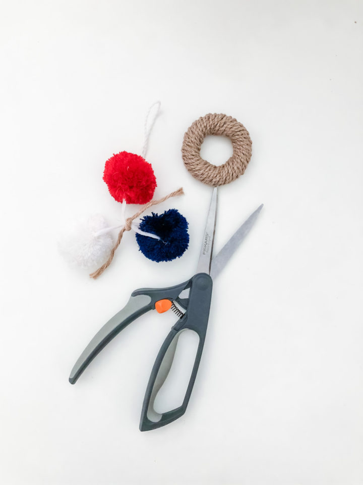 Cut your garland so that you have three poms – one of each color. Also cut a 4” strand of jute.