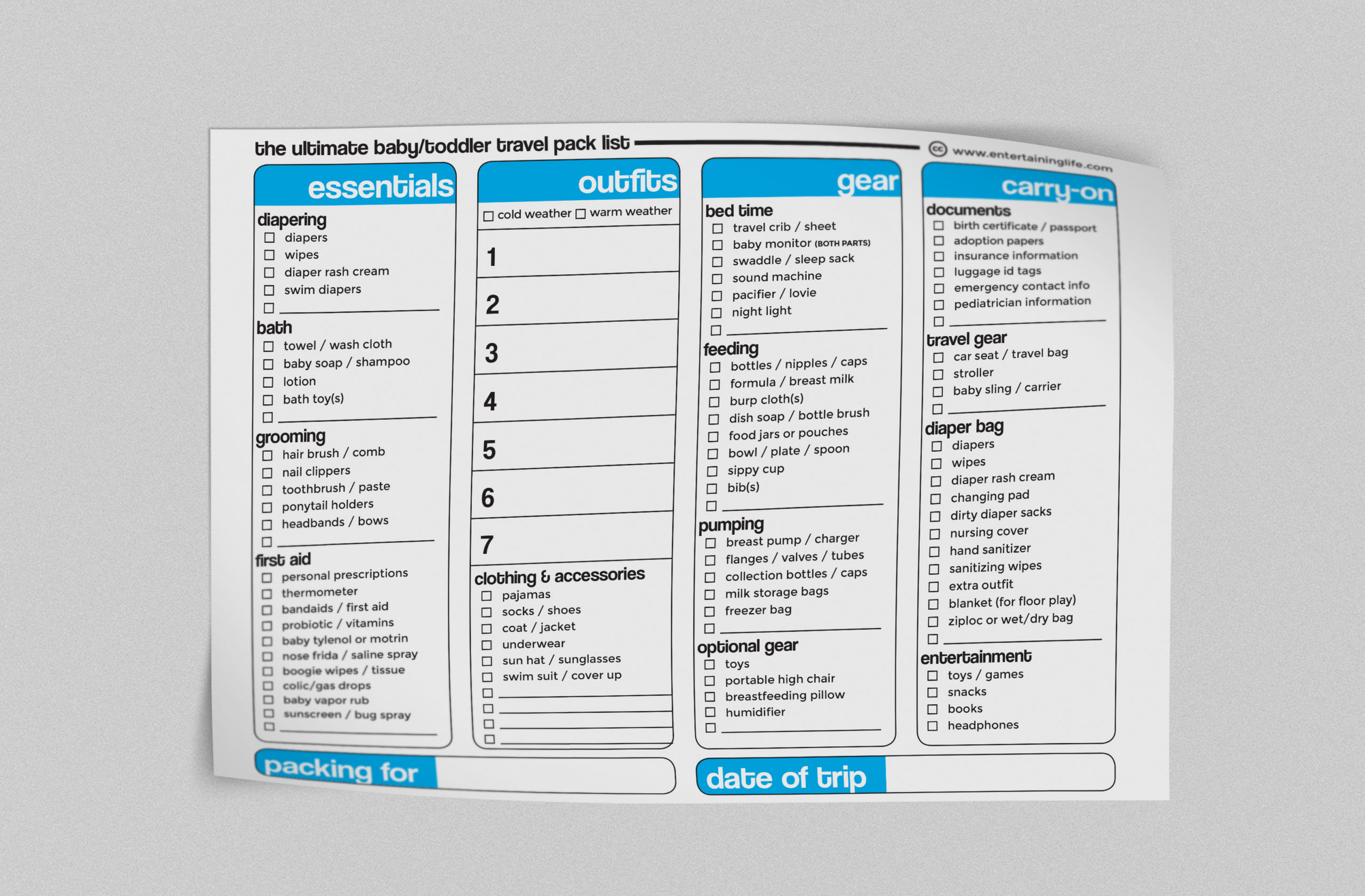 This baby travel packlist is comprehensive, and includes everything you will need on your trip, including: